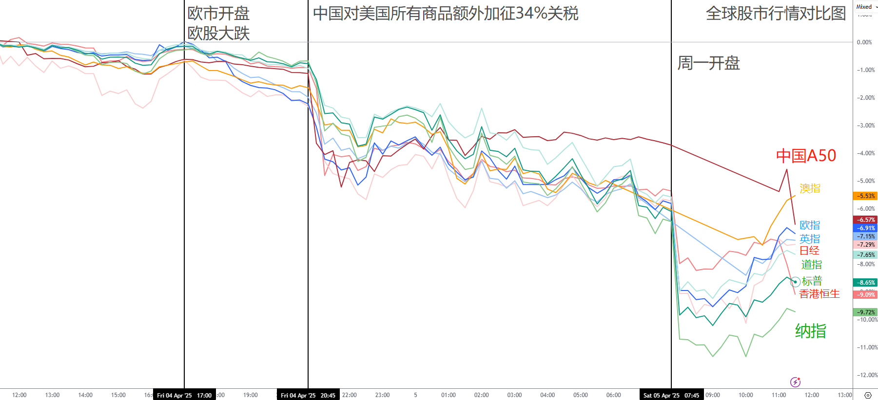 美国股市:美国股市自特朗普宣布实施全球关税以来,美股承压走低,拖累全球股市集体下挫。美股十一大板块无一幸免,三大指数同步下跌,其中纳指跌幅最大,道指亦表现疲软。真正引爆市场情绪的却是美股盘前:中国国务院发布反制措施,决定在现有关税基础上,对所有美国产品额外加征34%关税。受此消息影响,全球市场恐慌蔓延,股市普遍重挫。周末期间,悲观情绪持续发酵,华尔街多位重量级人物纷纷加入“经济衰退”阵营,另有传言称财长贝森特或将辞职,令市场更加动荡不安。受多重利空打击,美股周一开盘即跳空大跌,虽早盘略有反弹,但整体走势依然低迷。