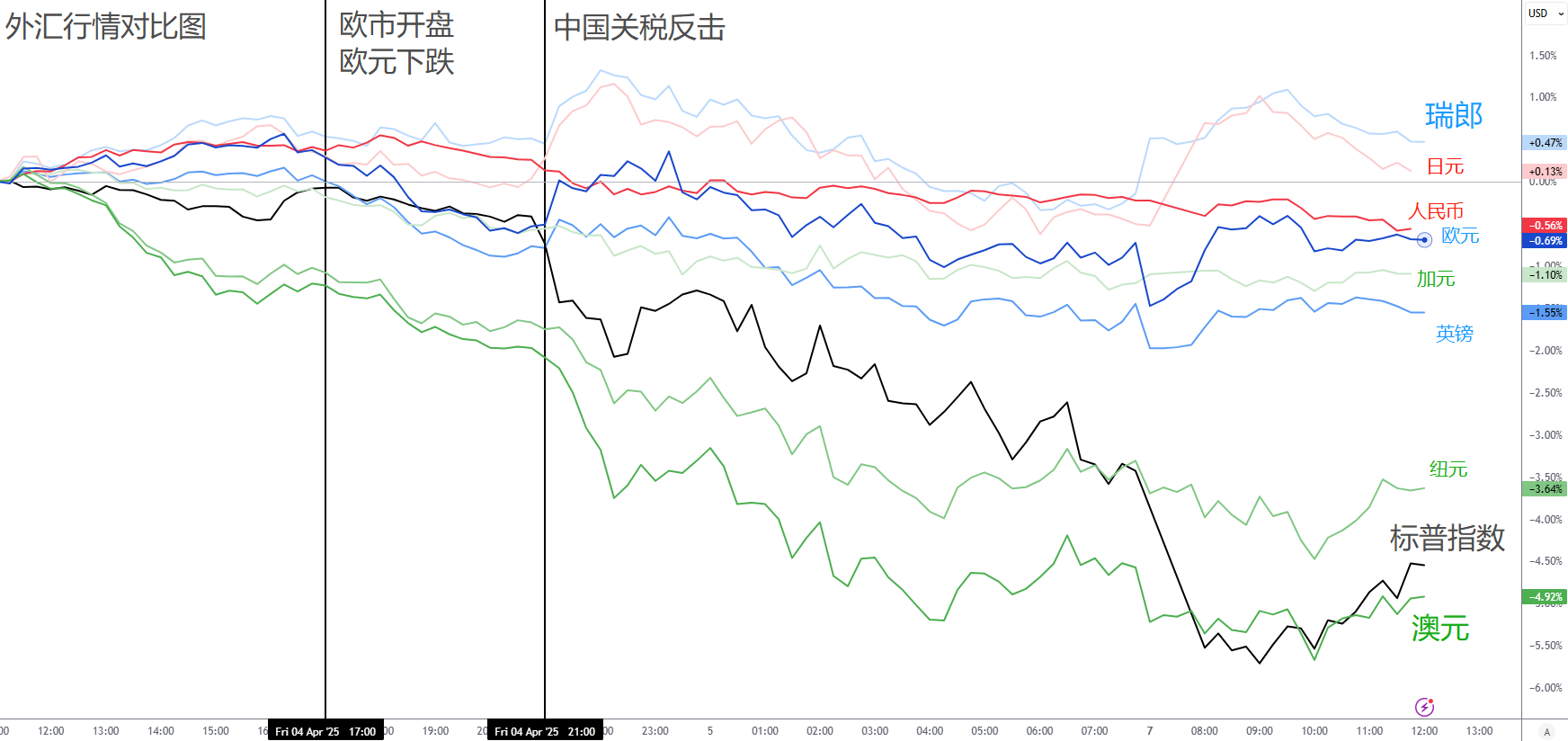 澳元与纽元:依旧受到美股绝对驱动,和其他非美货币形成了明显的分歧。再加上欧盘开始美元上涨,这两个货币沉重下跌。澳元单日跌幅竟然逼近5%,上一次这种表现还是疫情初期。可见市场正处在极端风险情绪当中。