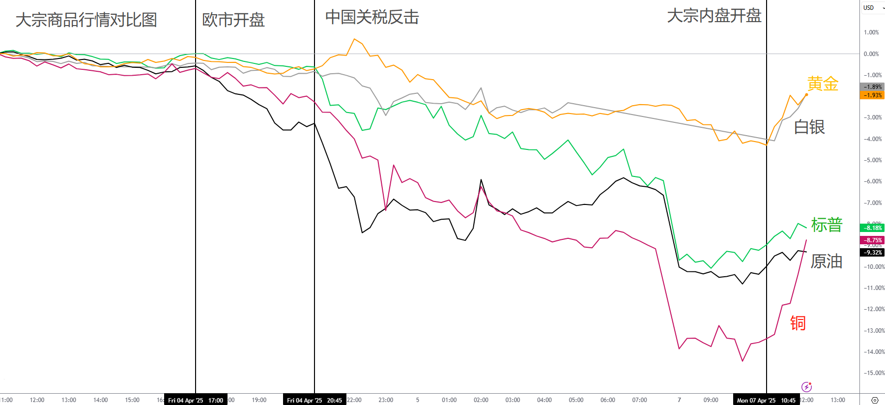 市场对全球贸易战的恐惧达到了顶点,极端风险爆发,除了日元和瑞郎外,包括美元在内的所有商品集体暴跌,其中跌幅最大的大宗商品,其次是全球股市。