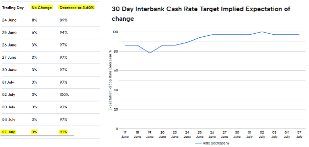 If confirmed, this would lower the official cash rate to 3.60% the lowest since the pandemic and mark the first back-to-back rate cuts in over a decade. It would signal a clear pivot in Australia’s monetary policy cycle toward stimulus and accommodation.
