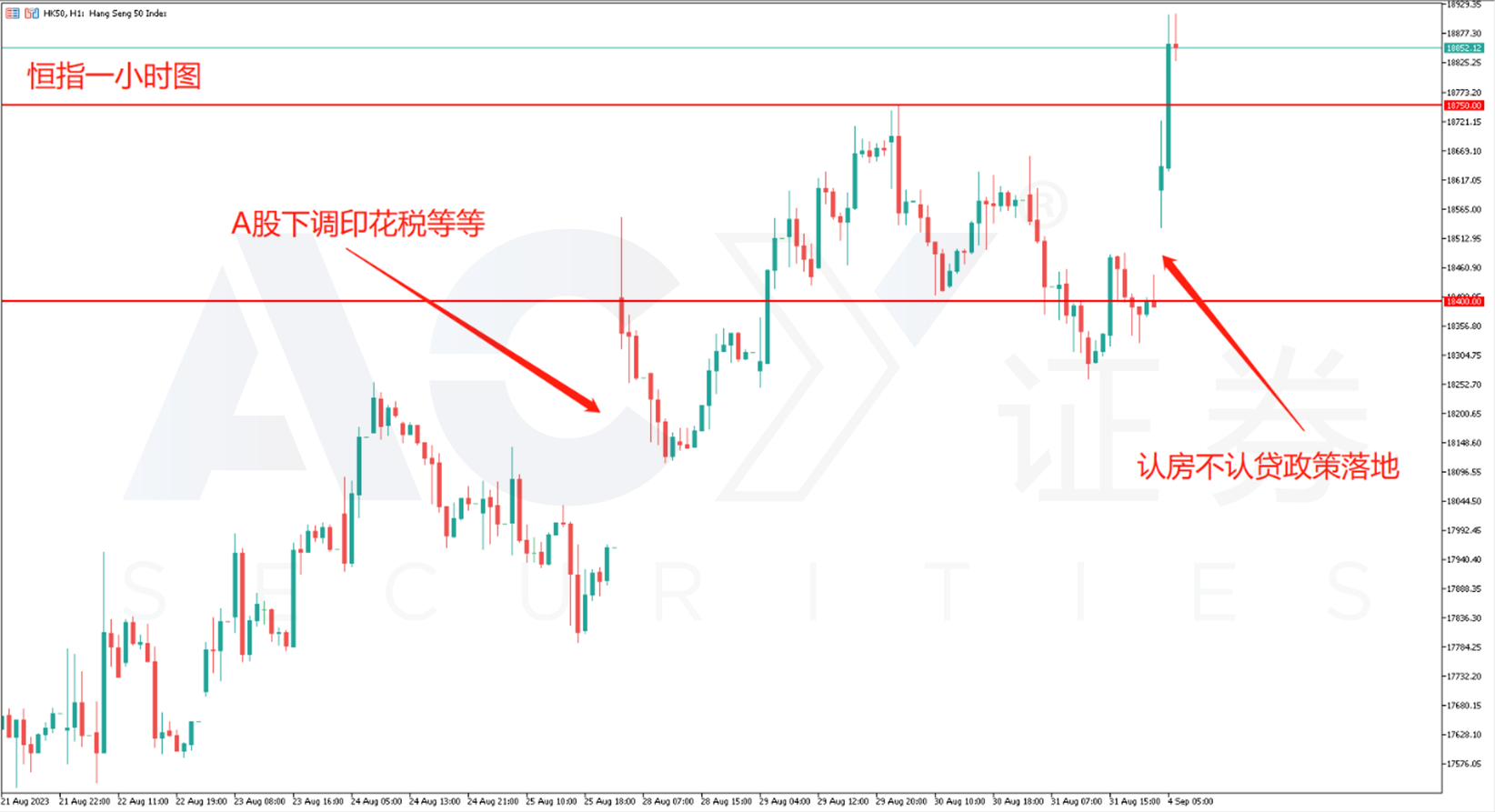 就拿恒生指数的近两周表现为例,两个周末,国内都有利好政策的发布,分别是上上周末的印花税下调、控制股东减持、降低融资保证金等等;以及上周末的认房不认贷政策在一线城市落地。在利好政策的影响下,虽然恒指都是周一跳空高开,但后续的行情却是截然相反,前者是高开低走,没能突破关键阻力;后者却是持续上涨,突破了前高阻力。