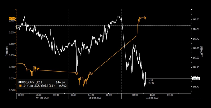 日本銀行はしばらく金融緩和政策を続けているようだ。9月の会合で政策を変更せず、植田総裁はハト派の立場を示し、金融政策を2%のインフレーション目標を達成するために調整し続ける方針を示唆している。 YCCは予想通り変更されずに維持された。短期金利は-0.1%、10年国債利回りの上限は1.0%である。この結果から、日銀は来年上半期を通じて政策を維持し続ける見込みであると予測される。以図は、9月の会合後の各日銀メンバーの金融政策の立場と、日米為替レートおよび10年債利回りの動向を示している。