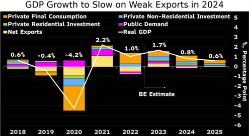2024年における日本のGDP成長は鈍化すると見込んでいる。原因として、円安による輸出促進効果が薄れ、2%のインフレ率達成を損ない。しかし、目標達成のために緩和政策を継続することは、円安などの圧力を増大させるだろう。私の予測では、日本銀行は2024年上半期までマイナス金利とYCCを維持し、その後、目標達成に向けて新しい枠組みへの移行を検討すると予想している。今年の成長率は、2022年の1.0%から1.7%に回復する見込みですが、2024年には0.8%、2025年には0.6%に減速すると予測されている。現在、円安によって引き起こされた高い輸入コストが、弱まる成長と原価プッシュ要因の減少に伴い、2024年第3四半期には2%を下回ると見込んでいる。コアインフレーションは、2023年に3.0%で推移し、その後、2024年に1.8%、2025年に0.7%に減少すると予測されている。