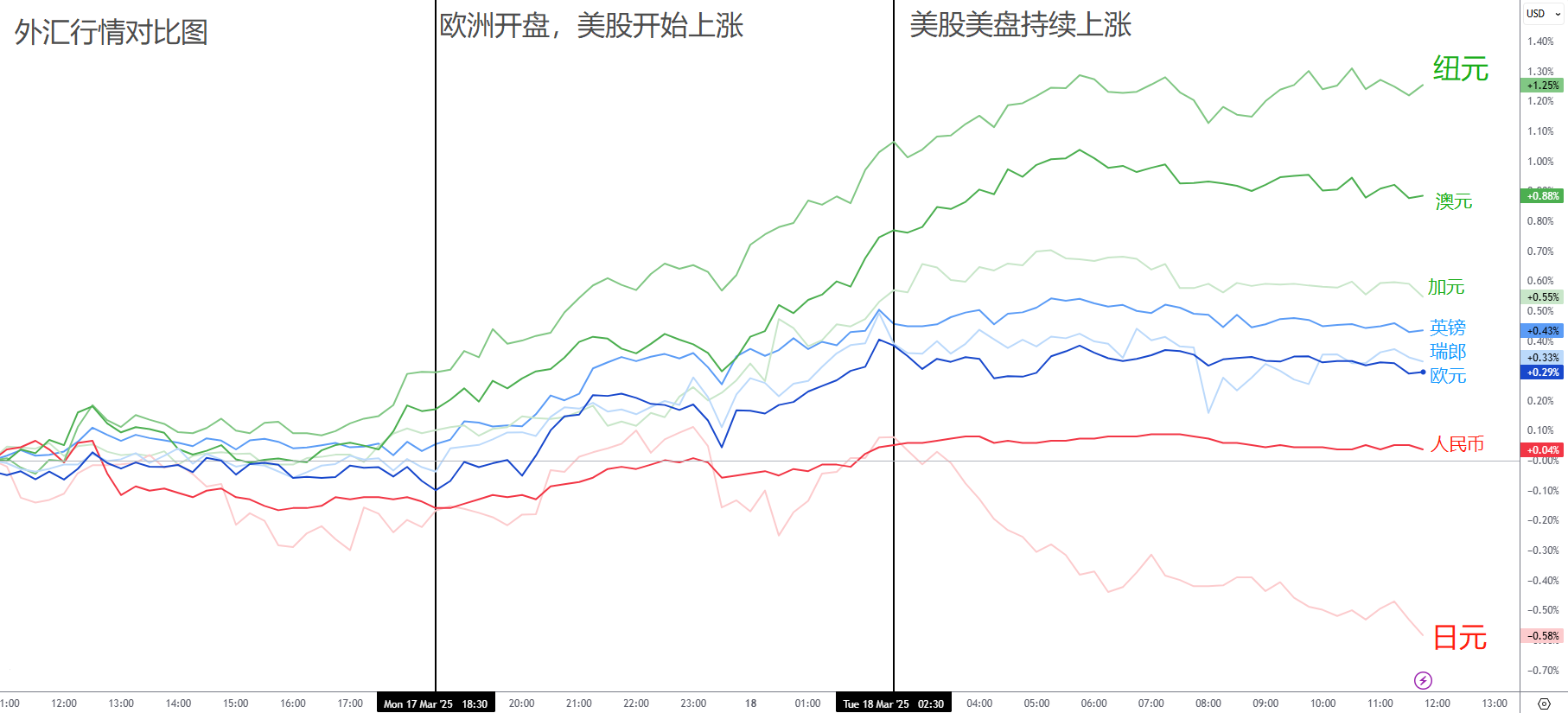商品货币:美股一涨,三大商品货币表现便较强。尤其是从欧洲开盘后,美股持续上涨,带动三大货币持续上扬,一直到美股收盘才结束。纽元全天表现最佳,澳元次之,加元相对落后。