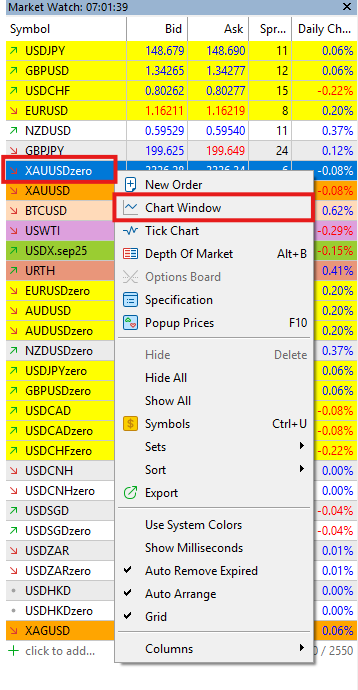 Mở Biểu đồ của Cặp Tiền/Tài Sản Muốn Giao Dịch: Chọn cặp tiền hoặc tài sản bạn muốn đặt lệnh từ cửa sổ "Market Watch" (Quan sát thị trường) và kéo thả vào khu vực biểu đồ, hoặc nhấp chuột phải vào cặp tiền/tài sản và chọn "Chart Window" (Cửa sổ biểu đồ).