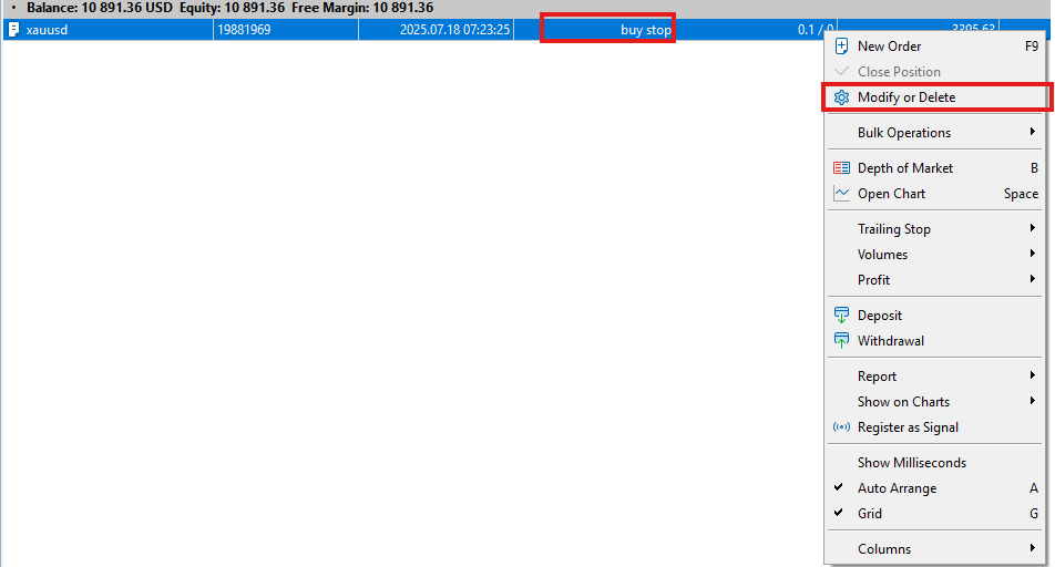 Nhấp chuột phải vào lệnh bạn muốn hủy trong cửa sổ "Trade".