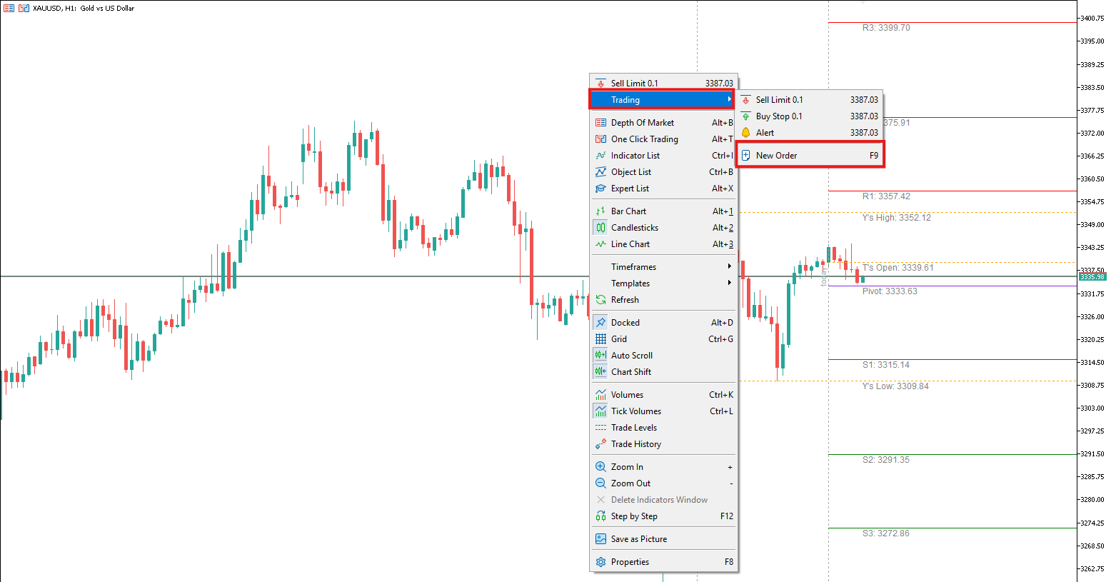 Hoặc nhấp chuột phải vào cặp tiền/tài sản và chọn "New Order" (Lệnh mới).