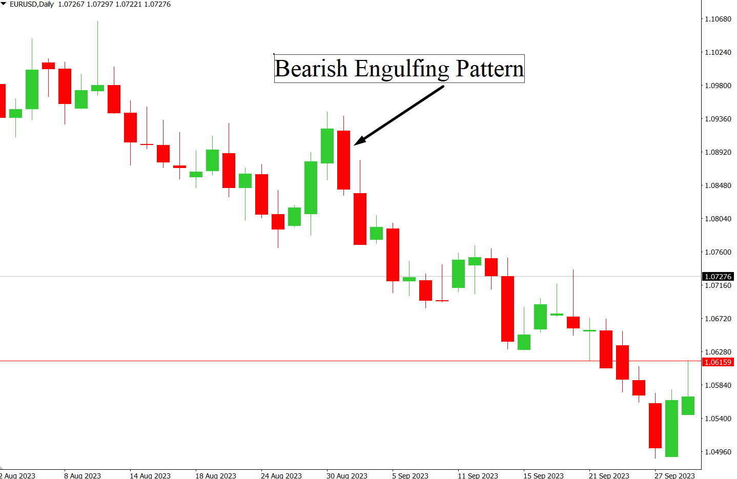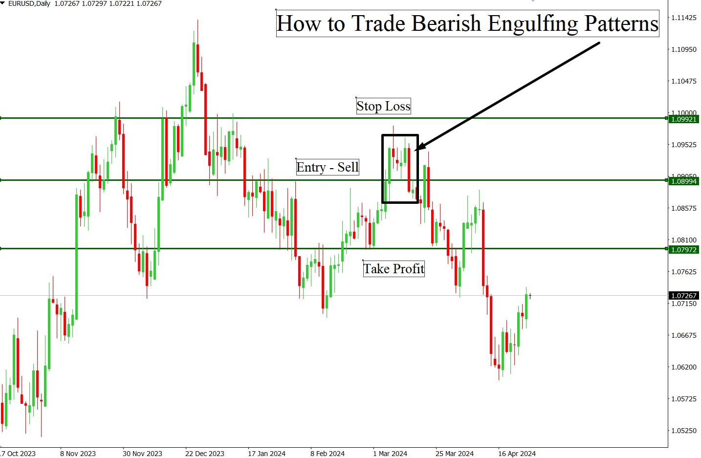 Engaging in forex trading with bearish engulfing patterns can be quite straightforward once you know what to look for. Here's a simplified explanation using the provided EUR/USD daily chart: