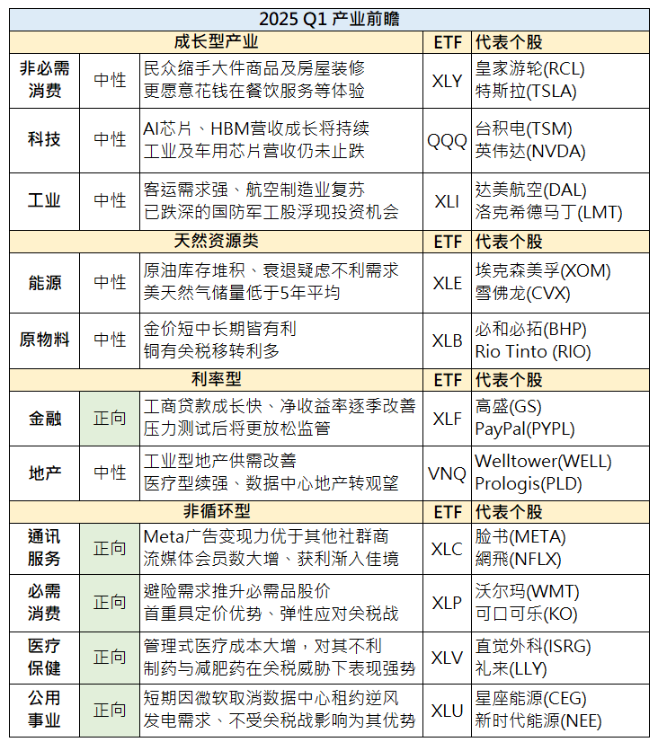 股价通常领先基本面一到两季提前反应,因此展望美股各产业板块在2025年第一季的基本面表现,可以协助投资人在3月布局相关个股或ETF。