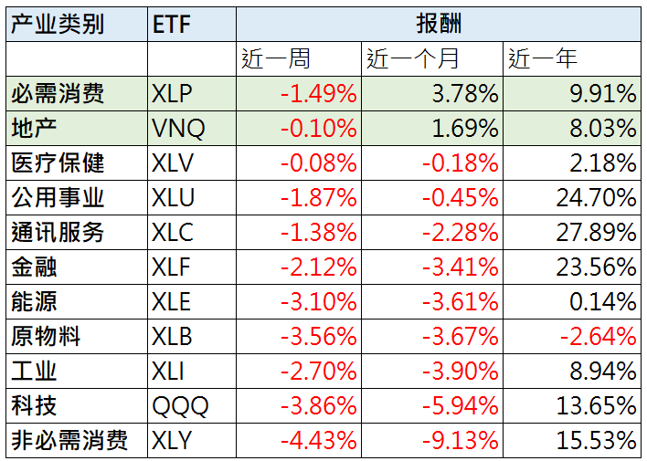 美国通胀下降速度停滞,持续打压大件商品与耐用品消费,民众缩手购屋也不利装修零售业,不过餐饮业却是近期黑马,因为家用食品的通胀攀升,和外食的花费差距变小,让更多民众选择到餐厅消费,而且家庭债务占比低,民众更愿意花钱在服务体验上,因第一大成分股特斯拉市盈率已过度扩张,非必需消费指数上行空间较为有限,整体持中性看待。