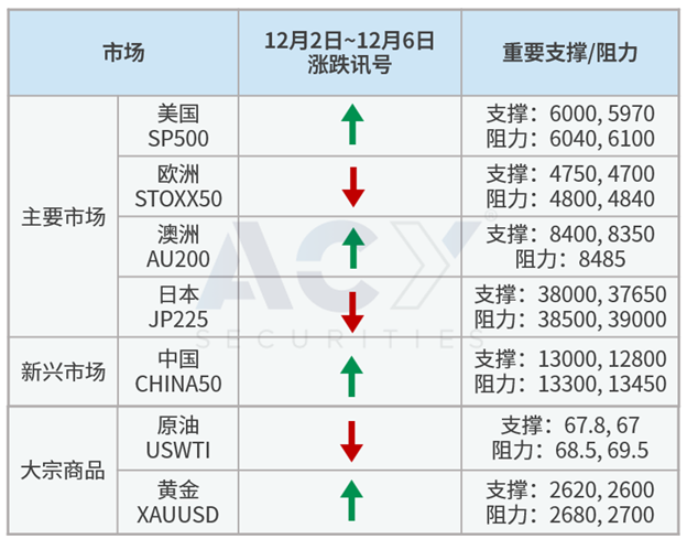 美股如预期在上周感恩节收涨,不过类股表现有显著差异,半导体最近一个月非常疲弱,非必需消费、金融和工业类股表现较佳,特朗普新任命的财政部长也缓解了持续上涨的美债收益率,让标普500和道琼上周再创新高,本周非农人数若能回归正常区间,将有助美股持续上行的趋势。