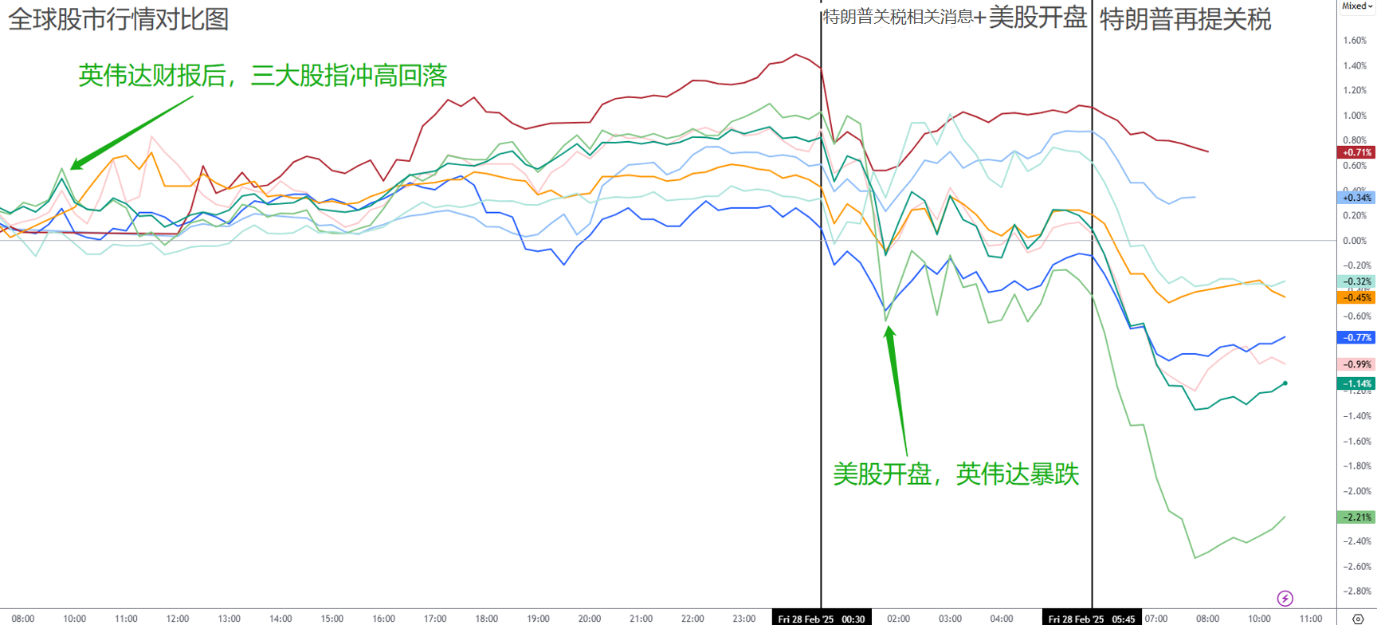不出意料, 英伟达财报发布后,美股低迷的表现延续到了美股开盘。特朗普对欧盟的关税态度越来越强硬,让欧元遭遇重创。日元再度体现避险功能,而黄金却和风险资产同跌。