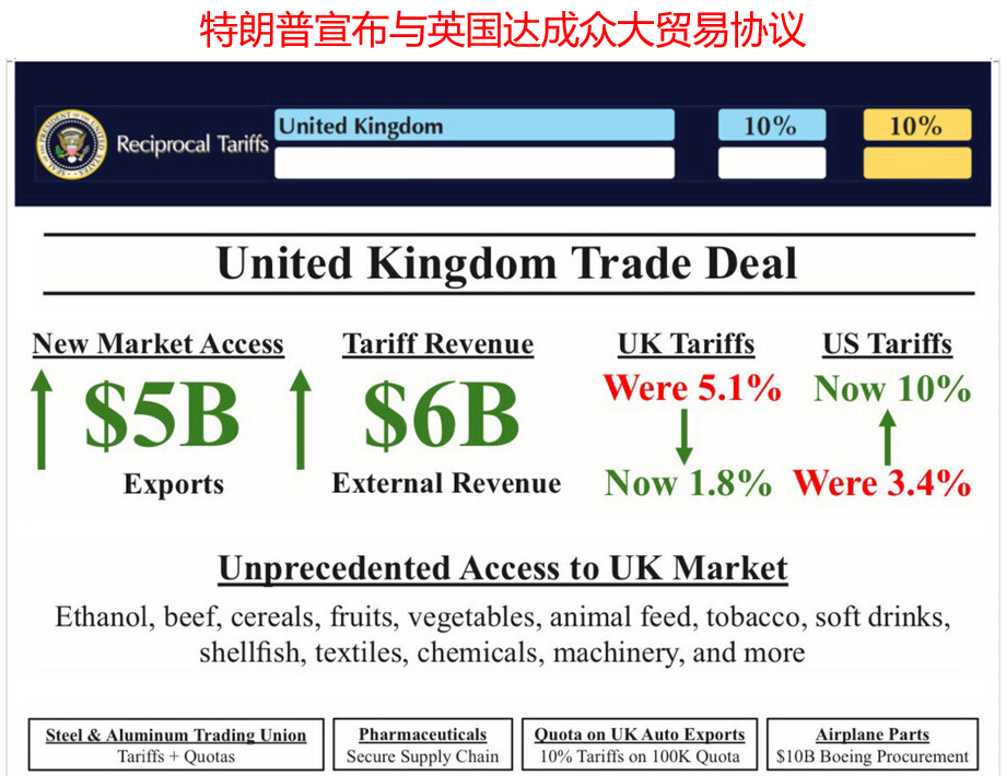 美国股市:美英之间达成重要的贸易协议,这是自「解放日」以来第一个这类协议。根据协议,美国将通过10%的关税获得约60亿美元的收入,也将为美国农民和生产商带来约50亿美元的新出口机会,至于英国出口到美国最大宗的汽车产品,在10万辆配额内,以10%的基准关税向美国出口,而钢铝出口关税甚至将由25%降为0。此外,美英两国将建立钢铝贸易区,并加强药品供应链的安全,提升双方的国家安全。这份协议也暗示:如果其他国家愿意配合美国,提出有诚意的合作建议,美国就乐于做生意。市场受此消息提振,美股三大指数全线走扬0.6%~1%不等。