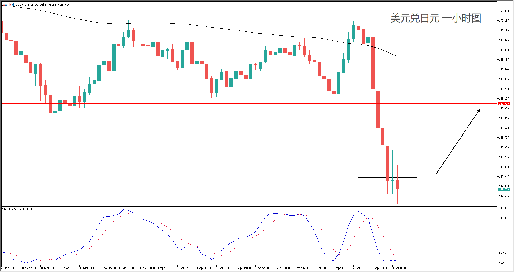 技术面: 100均线稳定向下,向下突破动能较强,逆势交易胜率较低,因此需要指标配合。美日多看可以等待随机指标形成底部金叉后回归中心区域,如果同时美日能够突破148关口,便是不错的跟涨信号。