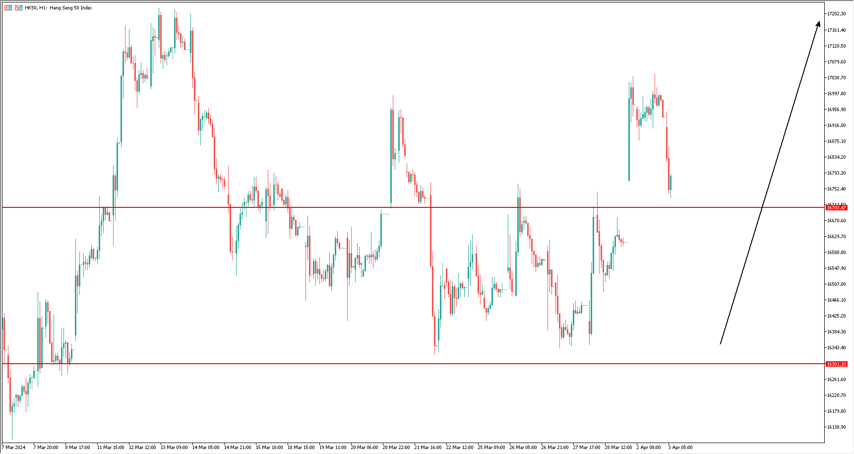 从恒生指数一小时图来看,由于缺乏利好消息,恒指已经在16000-17000区间上下震荡了快一个月有余,始终无法向上突破。这个动能就落在这个月中旬的3月房价报告,以及相关的房价指数发布。如果中国房市能够扭转颓势,那么恒生指数将获得突破动能,一举击穿17000大关的封锁。因此交易策略应该以逢低布局,并缩小盈亏比为主。或是等待消息发布,突破17000后跟随看涨。下方支撑分别在16700和16300两个位置。