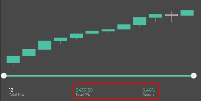 再来我们看绩效走势图当中的另外两个数字,如下图四。中间的数字为整个回测期间累计的损益,金额为美金439.39,但单看这个数字对于交易者来说意义不大,因为这个总损益直接受到我们交易金额大小的影响,举例来说,我们这个策略是当进场条件符合时作空10,000 AUDCAD,当我们将金额改成100,000 AUDCAD时,总损益的数字将直接变成美金4,393.9。明白了这个道理,各位就会知道右边这个数字要来得更有意义,因为报酬率是用总损益去除以交易金额而得来的,比较客观,也比较能和其他策略进行比较。至于6.46%的报酬率是怎么计算出来的?答案就是把获利的美金转换为澳币,接着除以10,000澳币,当时的澳币汇率为0.68017,因此(439.39 / 0.68017) / 10,000 = 6.46%。