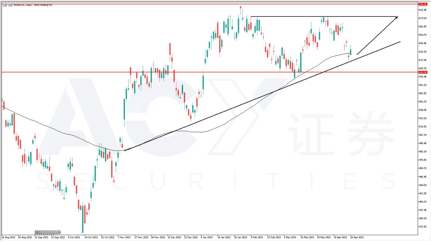 不过从ASML股价日线图来看,虽然上行趋势比台积电稳定,但今年还是以震荡为主。100均线保持上行,趋势线提供上行支撑。昨日股价同样冲高回落,说明上方还是有空头方对芯片需求的担忧。整体来看,交易策略应该以中短线逢低看涨为主,支撑位置在600-630区间,而阻力位置则要看680和700的前高点压力位。