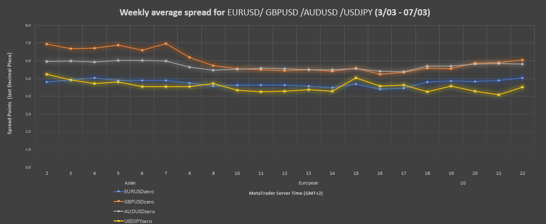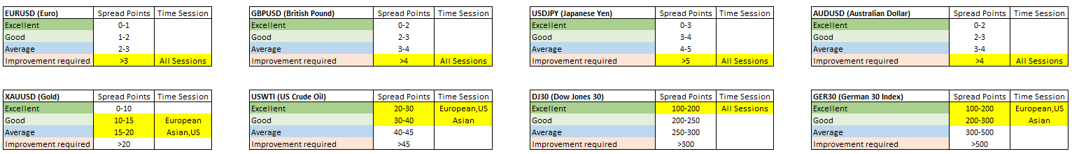 过去一周,EURUSD、GBPUSD、AUDUSD和USDJPY的点差在所有交易时段保持在“需改进”水平。