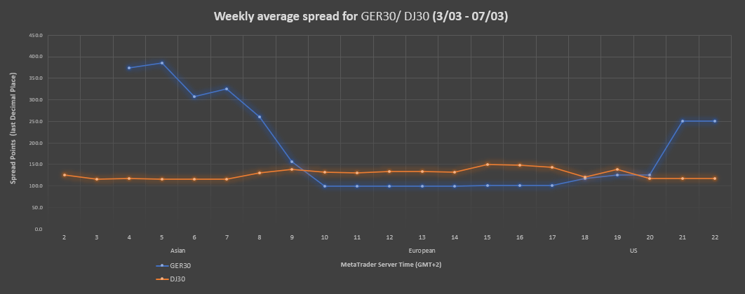 相比之下,GER30在亚洲时段由于交易平淡,点差处于“良好”水平。欧/美时段点差大幅收紧,达到了“优秀”水平(100-200点)。