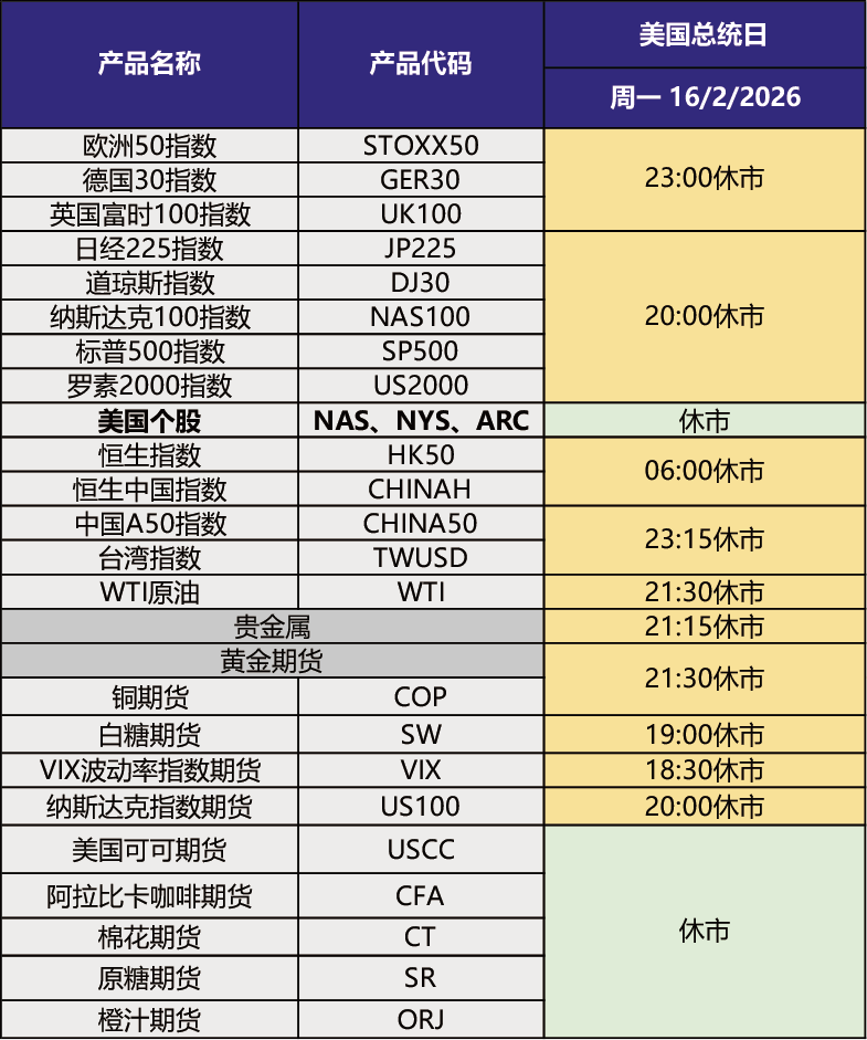 2026年2月16日(周一)是美国总统日假期;