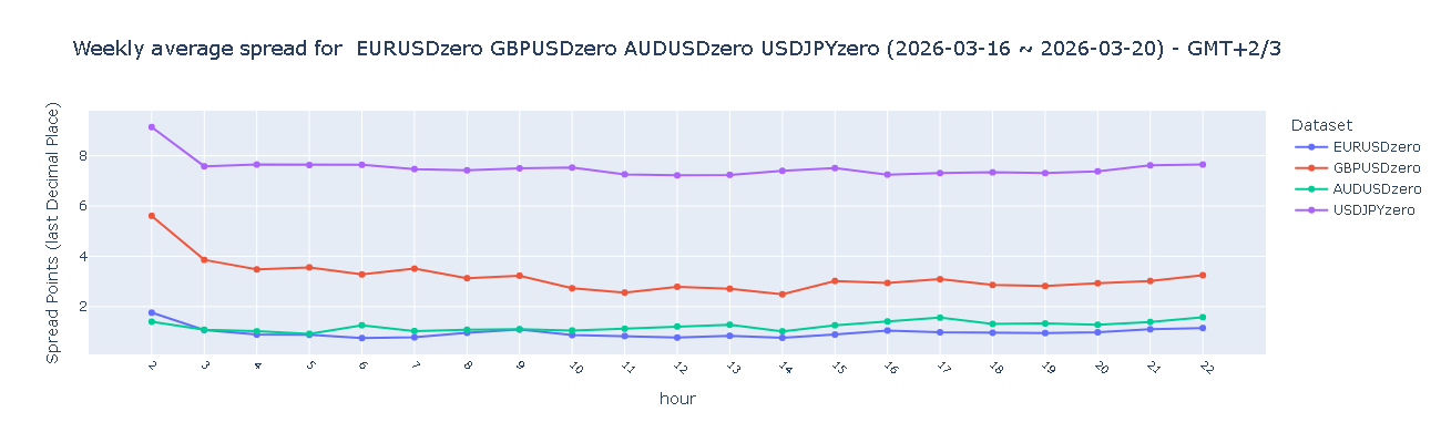 GBPUSD(英镑/美元)在欧盘及美盘时段录得"良好"水平(2–3点),亚盘时段点差走阔至"平均"水平(3–4点),表明在核心市场时段以外,该品种交易成本相对偏高。