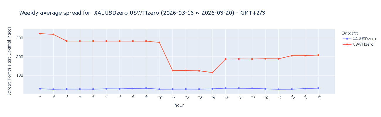 XAUUSD(黄金)在亚盘、欧盘及美盘时段点差均超过20点,归属"需要改进"类别,反映出各时段内存在阶段性流动性偏弱的情况。