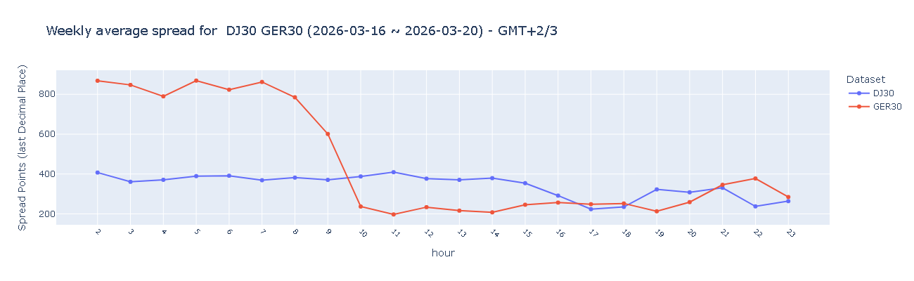 GER30(德国30指数)在欧盘及美盘时段录得"良好"水平(200–300点),亚盘时段则进一步恶化至"需要改进"水平(>500点),充分凸显该指数对非高峰时段流动性变化的高度敏感性。