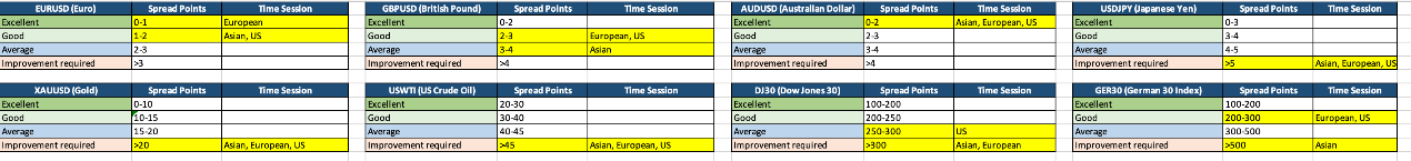 DJ30(道琼斯30指数)在美盘时段"平均"水平(250–300点)出现频率较高,亚盘及欧盘时段则频繁呈现"需要改进"水平(>300点),显示该指数交易条件因时段不同而存在一定波动。