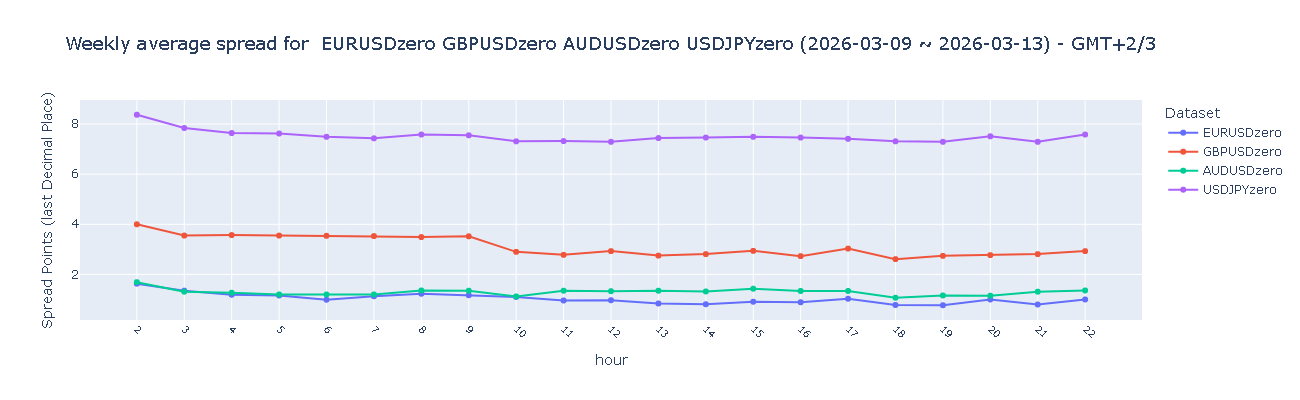 GBPUSD(英镑/美元)在欧盘及美盘时段录得"良好"水平(2–3点),亚盘时段点差走阔至"平均"水平(3–4点),表明在非高峰市场时段,该品种交易成本有所上升。