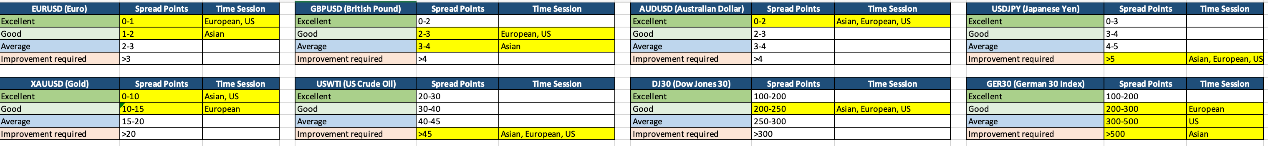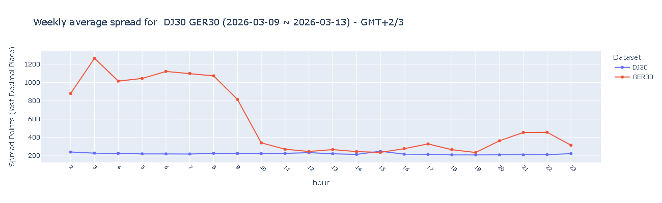 GER30(德国30指数)在欧盘时段录得"良好"水平(200–300点),美盘时段点差扩大至"平均"水平(300–500点),亚盘时段则进一步恶化至"需要改进"水平(>500点),充分凸显该指数对不同时区流动性变化的高度敏感性。