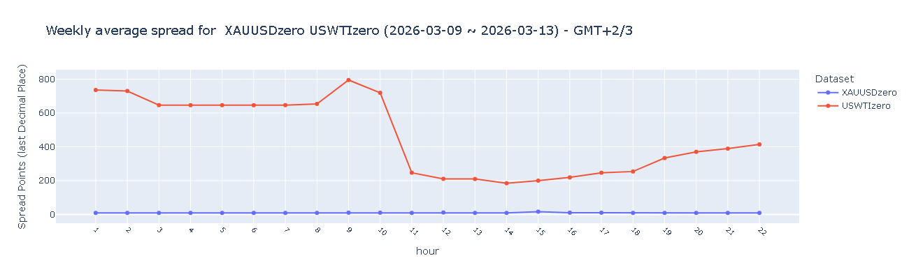 USWTI(美国原油)在亚盘、欧盘及美盘时段内,点差偶有走阔至"需要改进"水平(>45点),反映出该品种在特定时段存在流动性收缩的情况。