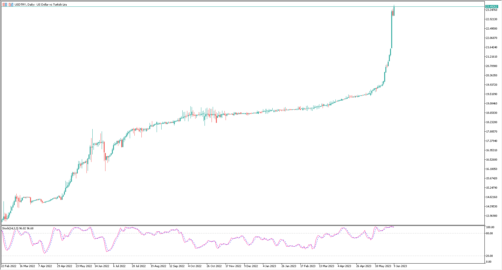 目前胜率最高的外汇交易便是美元对土耳其里拉。通胀预期锚定,总统态度坚决,央行唯唯诺诺,里拉基本没有任何反弹的可能。从美元兑土耳其里拉日线图来看,很难想象这竟然会是日线图的走势。依靠外汇储备,里拉在22年中旬到23年上旬放缓跌幅,然而大选刚过,外汇储备耗尽,里拉汇率爆发式贬值。交易策略应该以回踩做多为主。这种行情很难寻找到良好的支撑和阻力,需要通过技术指标来入场与离场。关注随机指标的低位金叉的入场信号和高位死叉的离场信号。需要注意该产品的点差与库存相对较高,入场需要考虑交易成本。