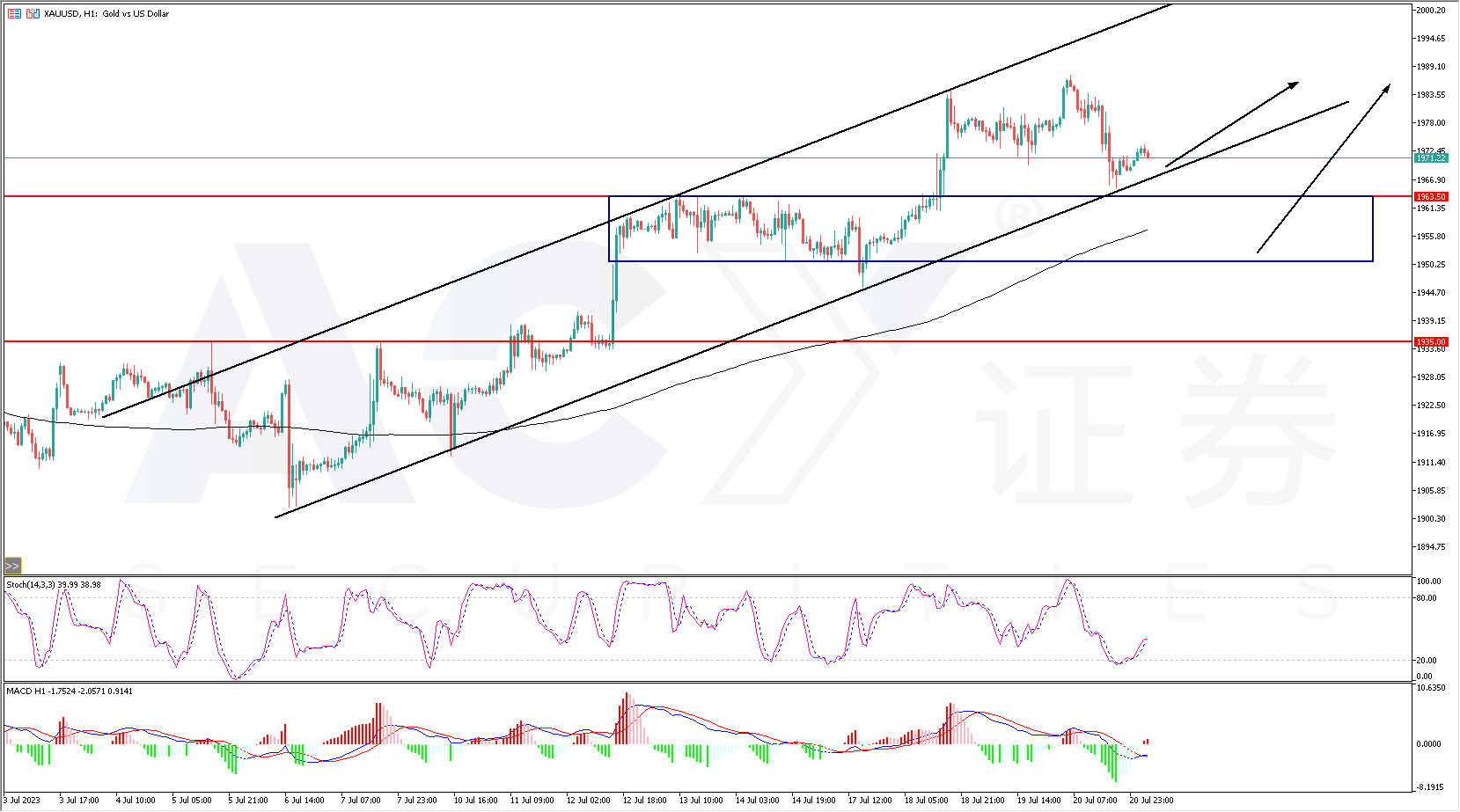 从黄金一小时图来看,受到CPI数据与通胀预期变化的影响(短线通胀下降,长线通胀上扬),金价阶段式突破上涨。指标方面,MACD形成底部金叉,同时随机指标保持开口回归中心区域,交易策略应该以短线逢低看涨为主。日内支撑要看1970附近,上升通道提供较强的支撑。不过考虑到情绪面的反复不定,金价有向下突破的可能。下方的短线支撑要看1950大关。现价上方的暂行阻力在1990-2000大关。