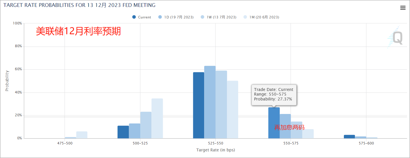 由此可见,这波国债利率的上涨是由通胀预期驱动的。换一句话来说,市场开始意识到现在的加息路径可能会导致通胀死灰复燃。此前年底降息的预期实则过于乐观,市场改变对了利率的观点。从Fedwatch数据来看,押注美联储年底降息的交易员占比本周急速下滑。
