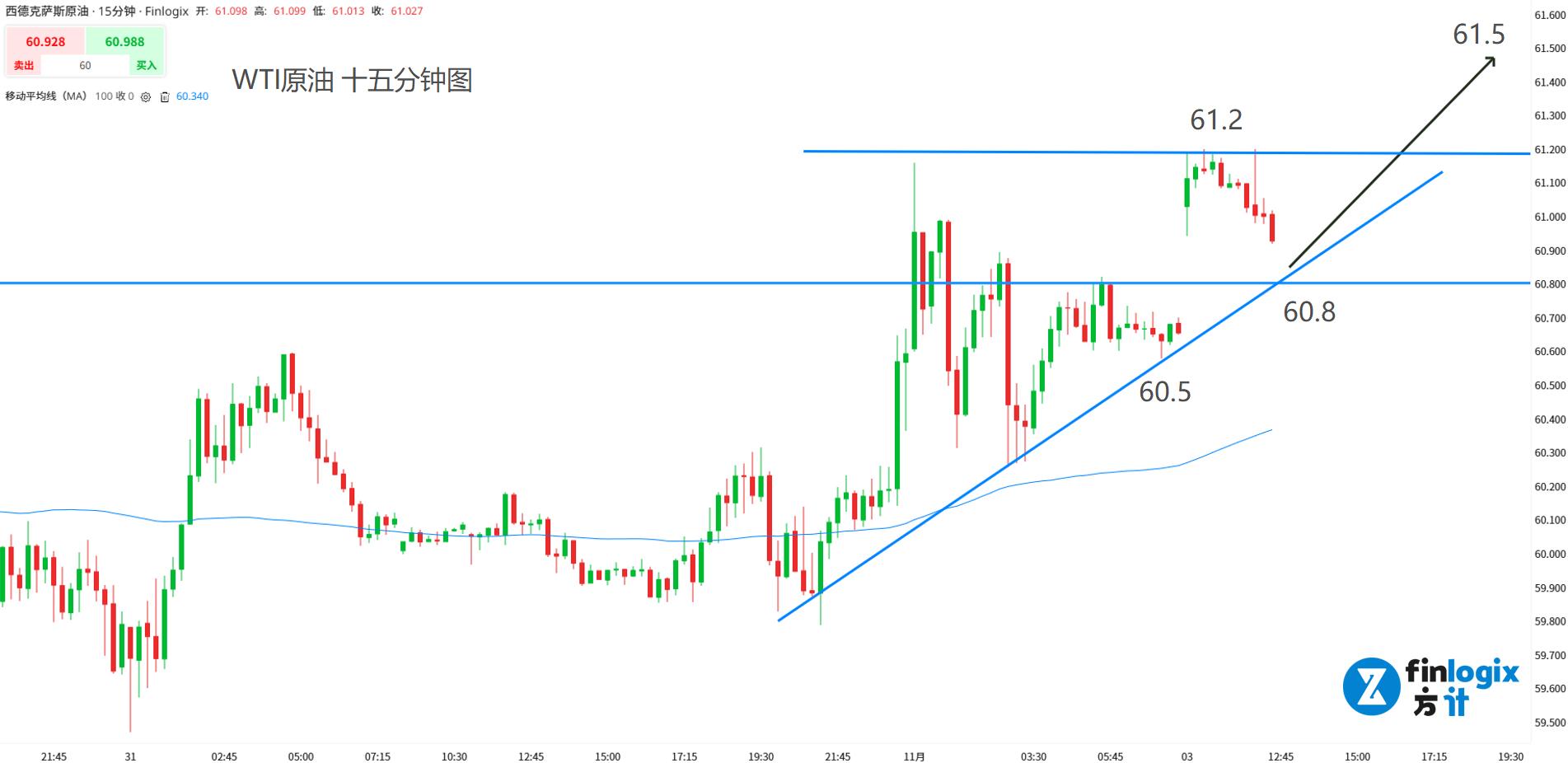 日内交易策略:(趋势跟随)回踩60.8低位看涨