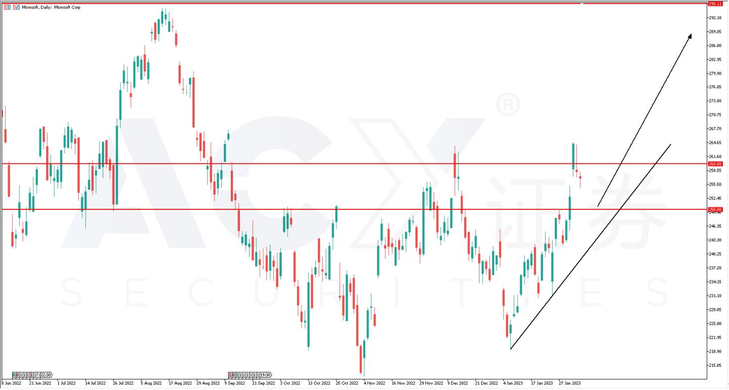 短线来看,百度与微软存在短线大涨的机会。以微软为例,一方面,微软对ChatGPT的投资让股东对其搜索引擎充满期待,另一方面,语言生产模型所依赖的数据中心与云服务业务正式微软的本近年财报中的核心增长点。从微软日前图来看,股价在抵达260的底部颈线后,受到加息预期升温影响,随大盘开始有所下滑。考虑到个股消息面的强势与板块弱势背离,交易策略应该以左侧回调做多为主。现价下方的支撑可以关注250关口,目标位置在265和295两个前高点位置,以波段行情快进快出为主。