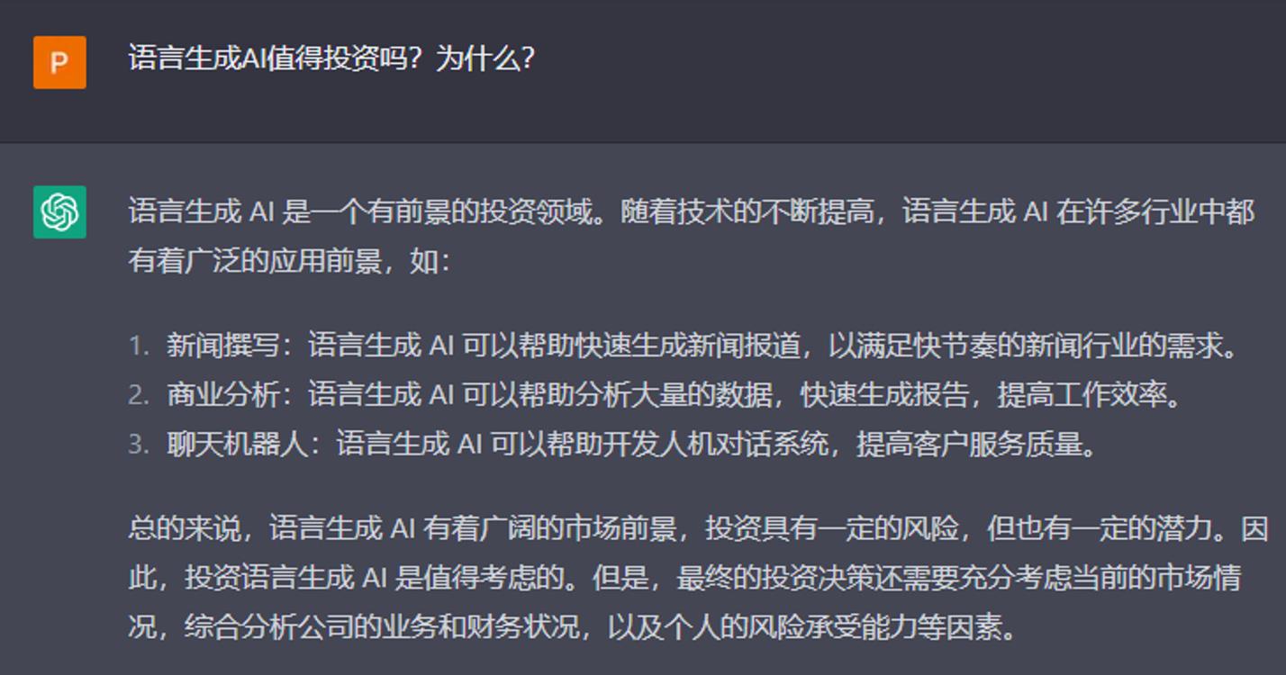 最近,由OpenAI开发的人工智能语言生成模型ChatGPT受到金融界的热烈讨论。ChatGPT的活跃用户在短短两个月内突破了一亿,打破了Tiktok九个月的记录,其功能性更是远超同行。在过去几个月里,ChatGPT不仅帮助大学生写论文拿下高分,还能通过宾夕法尼亚商学院的MBA期末考试,甚至能通过了谷歌三级工程师的入职测试。投资者对此纷纷侧目,想要知道这种语言生成AI是否值得投资?针对这个问题,我们询问了当事人ChatGPT的意见。