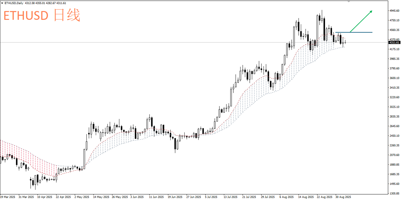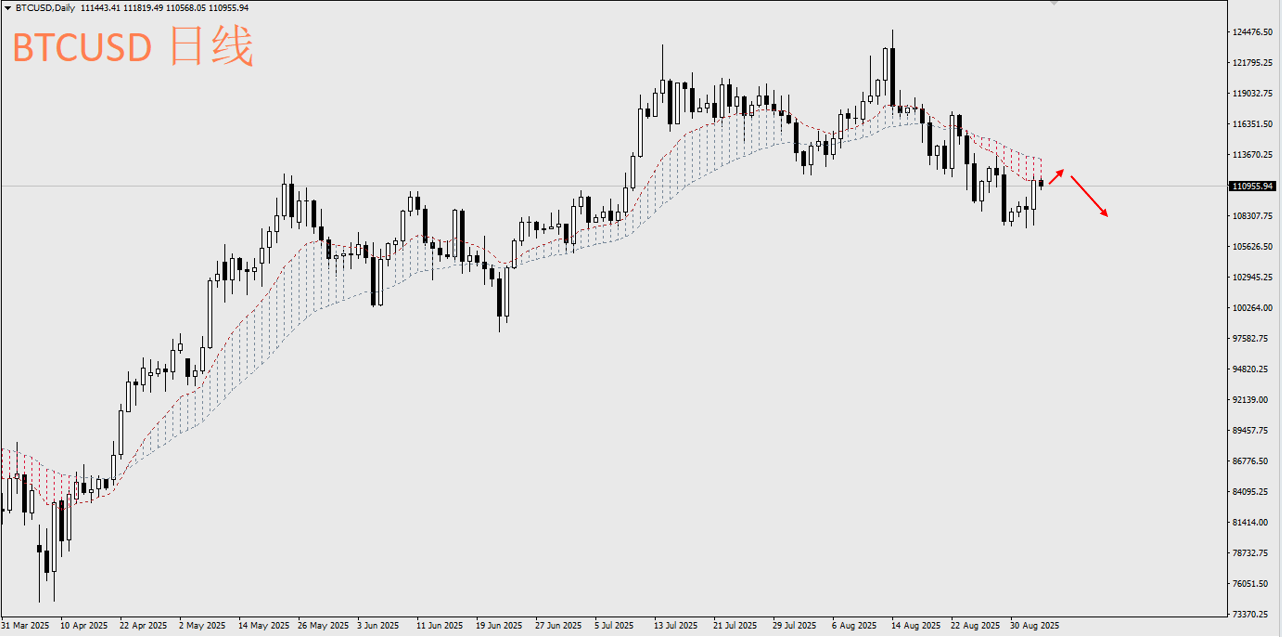 从走势上来看,BTC相较ETH弱势的格局仍在延续。目前比特币在短线走势上出现M头(双顶)形态,而且从ACY独家指标--多空带状均线来看,从8月24日也转为偏空格局,交易者可在111000~113500区间考虑布局空单。