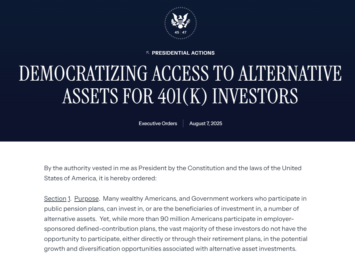 川普也于7日签署行政命令,正式开启规模高达12.5万亿美元的美国401(k)退休储蓄市场也能开始投资加密货币的政策,被视为将另类资产纳入主流退休产品的最广泛举措。