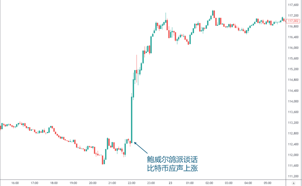 鲍威尔8月22日于杰克逊霍尔举办的全球央行年会发表任内最后一次演说,意外出现鸽派论调。其表示目前政策立场仍属紧缩,但随着展望与风险平衡的变化,可能需要调整政策立场,他同时指出川普的关税措施对通胀影响可能只是暂时的,带动当时BTC与ETH暴涨。