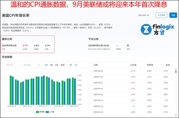昨日美国公布的7月CPI数据显示通胀压力仍相对温和,这让市场持续担忧的关税推动通胀急剧上升的情况再次缓和,广义CPI在同比涨幅为2.7%,低于预期的2.8%,虽然核心通胀受服务价格上涨而升至2月来的高位,然而市场不予理会,原因在于这些项目的上升跟关税政策并未有直接关系,也因此9月份美联储降息概率直奔95%,美股三大指数受此激励,纷纷走高,标普、纳指再次刷新史高。黄金走势一度也走高至3355美元,但后继无力,原油仍受美俄即将会谈的良好气氛下,持续下探…