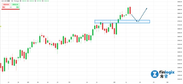 技术面:澳洲股指近期仍不断创新高,属于偏多格局,今日遭遇权重股回档修正,或许提供潜在入场做多机会,而8740~8770区域属于短期称压区以及关键K线的中值区域,或将提供支撑。
