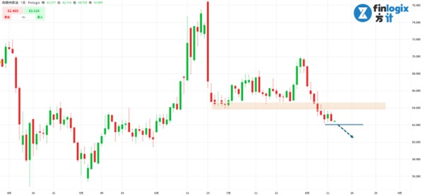 技术面:WTI原油于8月6日跌破此前区间下缘(63.6)之后转为偏空格局,昨日反弹至63.6后再次转头向下,一定程度上确认63.6~64.4阻力区域的有效性。在短线顺势考量下,若跌破62.18(两个多月的低位),或有持续向下动能。