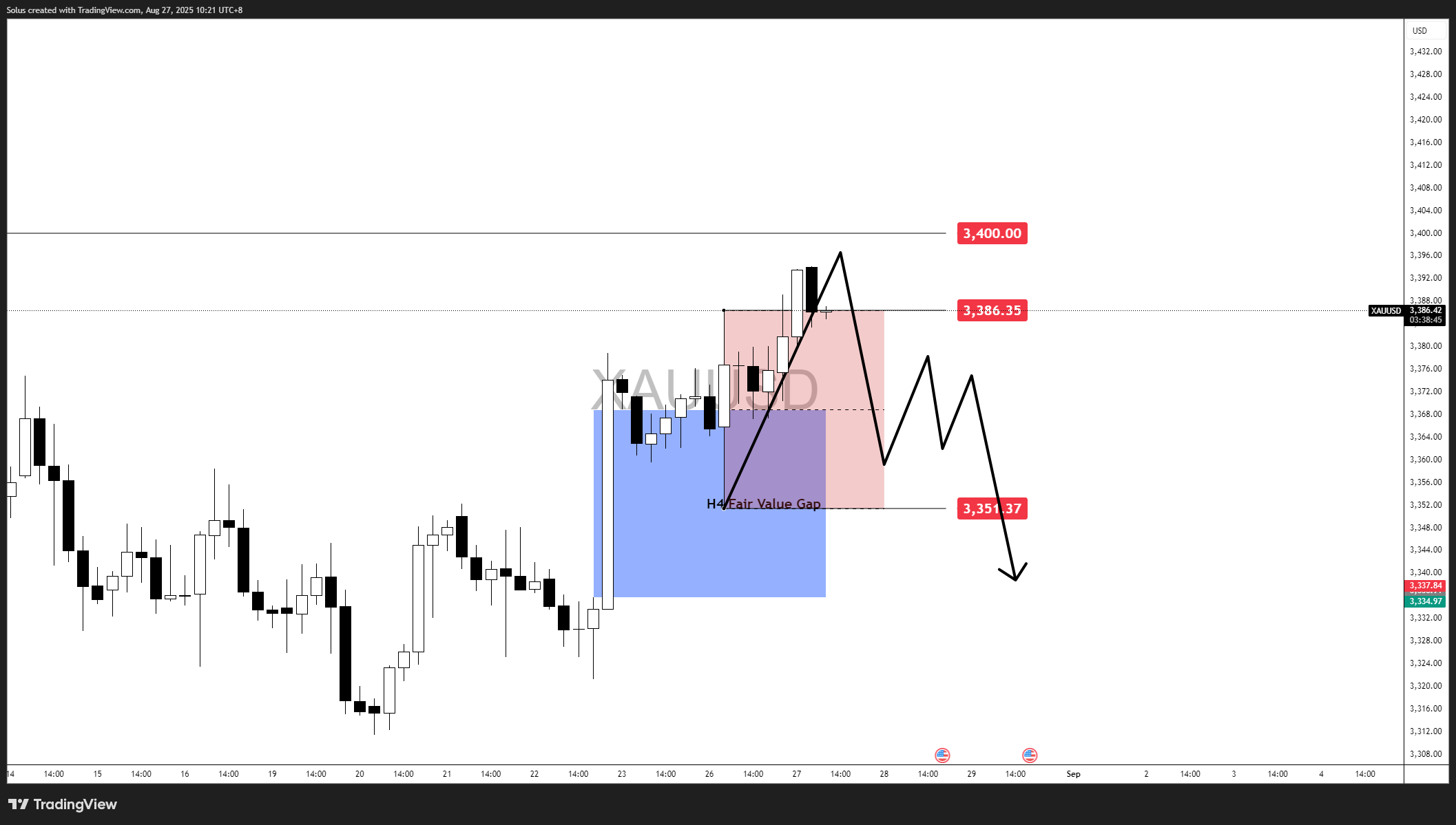 Rejection at $3,386–$3,400 and breakdown into the H4 FVG.