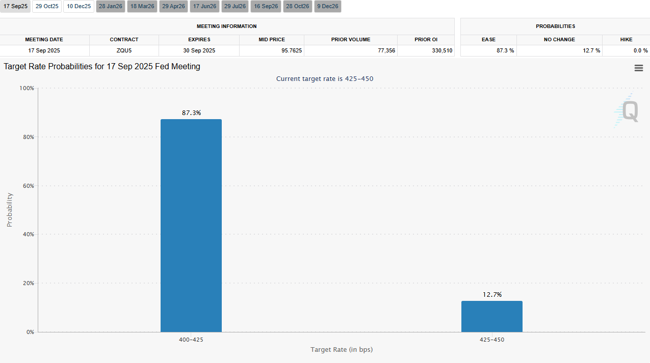 Rate expectations tightened in gold’s favor. Across the week, CME FedWatch probabilities for a September cut swung into a high-confidence range (variously cited around ~83% and ~89% by major outlets), underscoring the market’s conviction that policy easing is near. That USD drift + lower real-rate impulse is the classic cocktail for bullion bids.