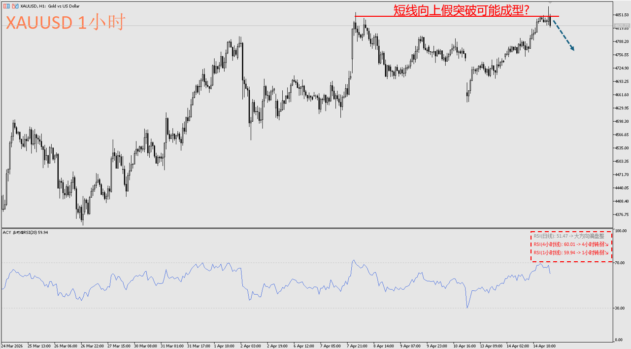 技术面:昨天金价如预期突破4800后有短多的空间,然而当前,小时线价格形态上,有机会出现向上假突破形态,加上透过ACY独家指标<多时框RSI>观察日线、4小时线以及1小时线的RSI变化,4小时线与小时线的RSI于相对高位有转弱迹象,,因此考虑若稍后北京时间11:00,K线收盘在4835以下,则现价~4855,有考虑做空的机会。