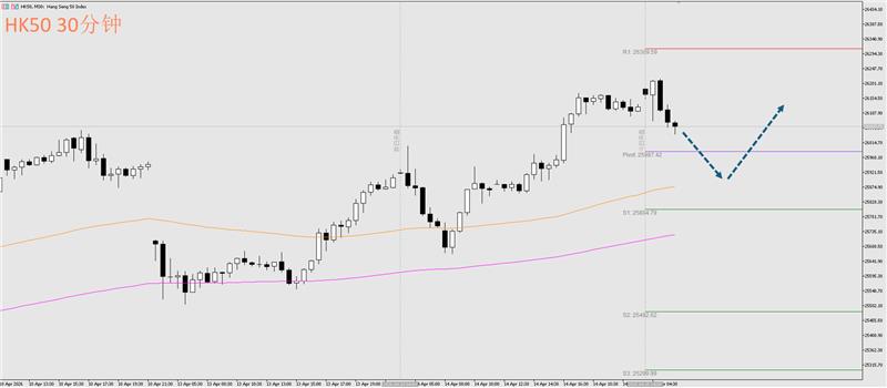 技术面:从ACY独家指标<高级枢纽点>的交易体系来看,目前HK50偏多,不过早盘高开低走,因此应该要寻觅机会做多,因此若稍后行情有回踩到S1(第一支撑位,25804)及Pivot(枢纽点,25987)区域,接着有所企稳,便有考虑做多的机会。