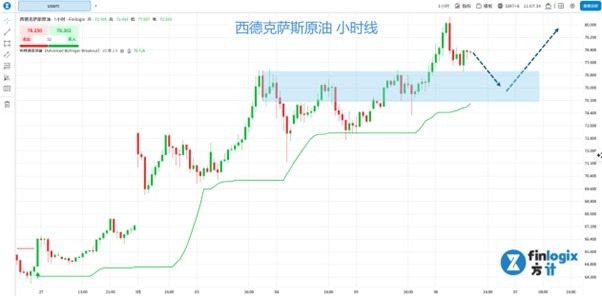 技术面:目前关于美伊战事的消息莫衷一是,瞬息万变,但从1月13日以来,笔者按照技术走势的规划大抵都能捕抓行情,这也说明了形态分析一定程度的有效性,并且能杜绝无效的杂音,当前油价仍是多头格局,同样使用独家指标”布林通道突破”来对行情进行判读,当前小时线位于绿色追踪线之上,表示小时框上油价仍强势,可等待回踩至75~77区间企稳后,分批考虑做多。