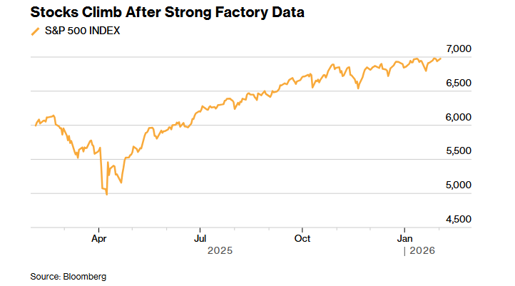 Chỉ số S&P 500 đóng cửa gần mức cao nhất mọi thời đại, với các lĩnh vực nhạy cảm về kinh tế dẫn đầu khi hoạt động sản xuất mở rộng mạnh nhất kể từ năm 2022. Chỉ số Russell 2000 của các công ty nhỏ tăng 1%. Trong khi vàng giảm, nó đã hạn chế sự sụt giảm trước đó. Dầu giảm khi phí bảo hiểm địa chính trị giảm dần sau khi Tổng thống Donald Trump cho biết Washington đang đàm phán với Iran.