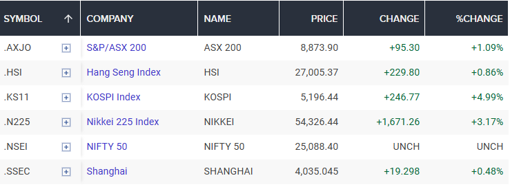 Thị trường châu Á - Thái Bình Dương tăng hôm thứ Ba sau khi Tổng thống Mỹ Donald Trump cho biết Washington và Ấn Độ đã đạt được thỏa thuận thương mại và sẽ ngay lập tức bắt đầu cắt giảm thuế quan đối với hàng hóa của nhau.